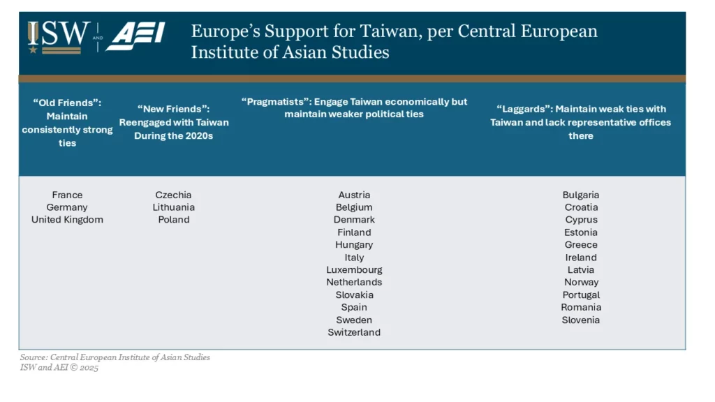 European think tank Central European Institute of Asian Studies (CEIAS) released a report finding that EU-Taiwan mutual visits have increased sixfold since 2019. These findings reflect Europe’s efforts to balance economic engagement with the PRC against diplomatic support for Taiwan. CEIAS demarcated European states into four categories: “old friends” maintaining consistently strong ties with Taiwan, “new friends” that reinvigorated cooperation in the 2020s, “pragmatists” with strong economic but weak political ties, and “laggards” with no representative offices in Taiwan.[68] The report’s executive summary stated that “Taiwan’s central role in critical supply chains—particularly in advanced technologies such as semiconductors—has further elevated its importance in European strategic thinking, while uncertainty surrounding U.S. foreign policy has reinforced incentives for more autonomous and diversified cooperation.”[69] The report recommended that Taiwan and Europe continue to deepen their ties across political parties and diversify beyond semiconductors to build economic ties.[70]The PRC is actively working to erode Taiwan’s international support, including by offering economic inducements to dissuade countries from recognizing Taiwan. Taiwan’s only formal diplomatic ally in Europe is the Holy See.[71] Other states that recognize Taiwan globally include Belize, Paraguay, Guatemala, Haiti, St. Lucia, St. Kitts and Nevis, St. Vincent and the Grenadines, and Eswatini, as well as Pacific island states Tuvalu, Palau, and the Marshall Islands.[72]
