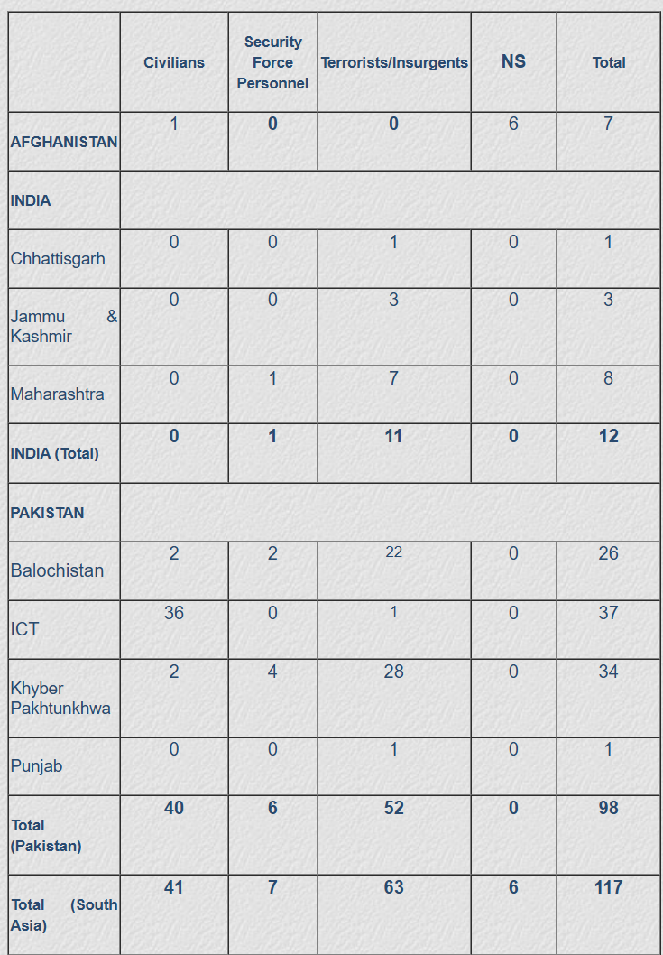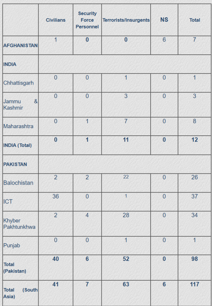 Occasional incidents of terrorism have persisted in Islamabad, though no year has seen fatalities cross double digits. Of the four terrorism-related incidents in 2025, apart from November 11-sucide blast, the only one to inflict fatalities was on November 29, when one Police Assistant Sub-Inspector (ASI), Akbar Khan, was shot dead by unidentified assailants in the jurisdiction of the Sabzi Mandi Police Station. ASI Khan, a resident of the Karak District of Khyber Pakhtunkhwa (KP), was deployed at the Supreme Court of Pakistan, when unidentified assailants opened fire on him. The other two terrorism-related incidents of the year were: