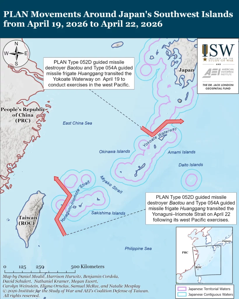 The PRC is likely attempting to impose costs on Japan for military cooperation with regional partners. The PRC likely views a resurgent Japanese military as a significant threat to PRC regional ambitions. The Japan Self-Defense Forces are participating in the Philippines-led Balikatan exercises from April 20 to May 8 for the first time, alongside the United States and Canada.[53] Japanese destroyer JS Ikazuchi transited the Taiwan Strait on April 17 on the way to the exercises, the first Japanese transit of the strait since June 2025.[54] A PRC MFA Spokesperson described the transit as a “deliberate provocation” and condemned Japan’s participation in the Balikatan exercises.[55] The PLA Eastern Theater Command (ETC) announced on April 19 that it would conduct naval exercises in the western Pacific Ocean with a Type 052D guided missile destroyer and a Type 054A guided missile frigate.[56] Both vessels transited Japan’s Yokoate Waterway on April 19, traveling toward the Western Pacific, and came back to the East China Sea through the Yonaguni–Iriomote Strait on April 22.[57] The Yokoate Waterway is much narrower and closer to Japan’s main island than the Miyako Strait, the normal passage for PLAN vessels deploying to the Western Pacific, indicating the PLA chose this route as a response to Japan’s Taiwan Strait transit.[58] China Military Bugle, the official press account of the PLA on social media, posted an image on Weibo depicting the JS Ikazuchi crewed by a figure representing Japanese World War II-era militarism being struck with a hammer decorated with the PRC flag, suggesting that the ETC exercise is intended as a response to Japanese military activity.[59]
