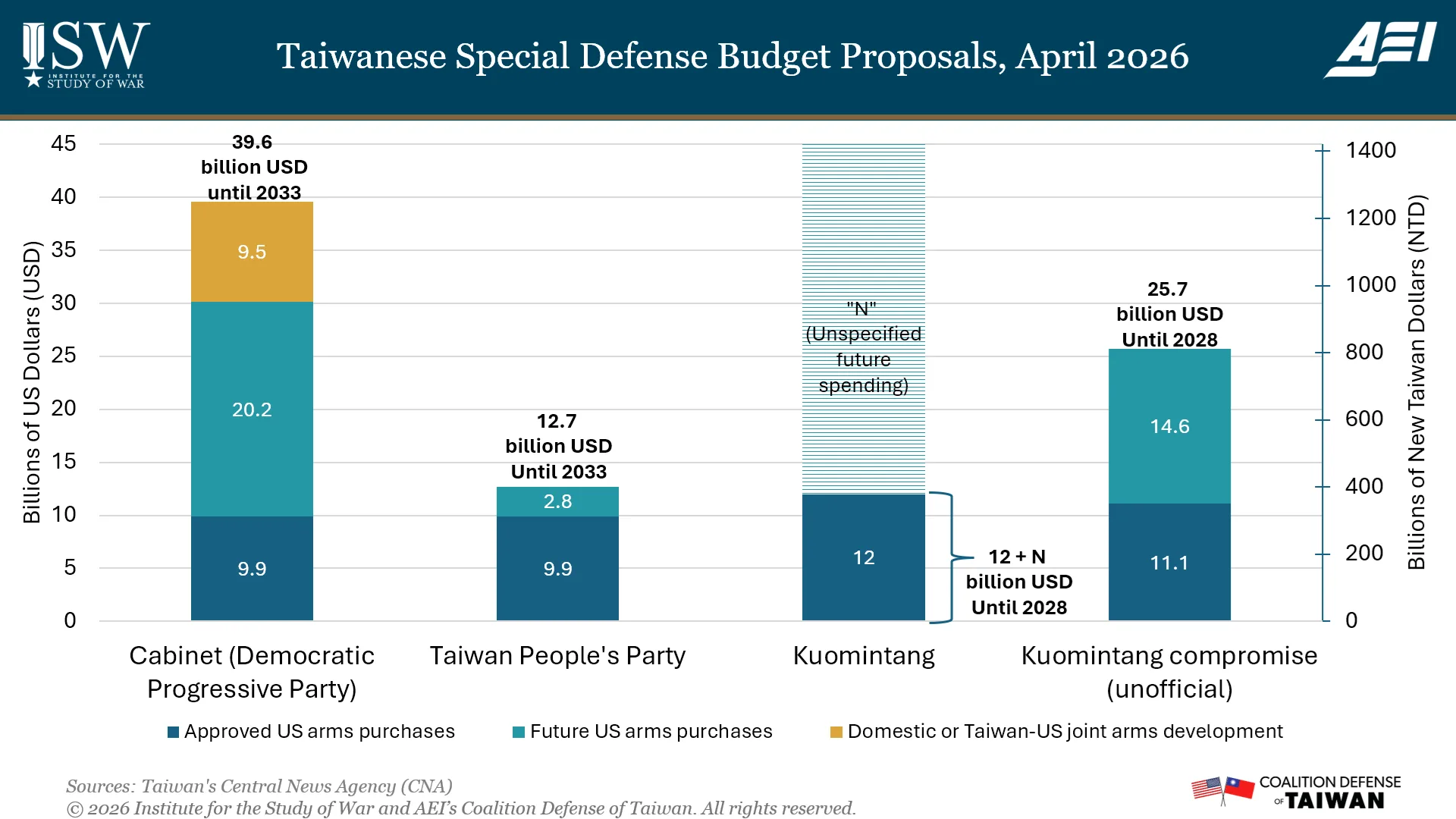 Former KMT vice presidential candidate Jaw Shaw-kong on April 19 proposed a “compromise” special budget of 810 billion NTD (approximately 25.69 billion USD) to help resolve the deadlock.[29] A DPP lawmaker called the proposal a “first step of goodwill.”[30] Jaw’s proposal includes 350 billion NTD for systems that the United States has already agreed to sell to Taiwan. An additional 460 billion NTD would be frozen until the United States approves further arms sales. The proposal resembles the existing KMT bill but replaces the “+ N” component with a concrete number, which Jaw argued would make the budget easier to explain to US officials. Other KMT figures, including legislator Hsu Chiao-hsin, former legislator Jason Hsu, and Taichung mayor Lu Shiow-yen, have backed special budgets of between 800 billion NTD (approximately 25 billion USD) and 1 trillion NTD (approximately 32 billion USD).[31] TPP Chairman Huang Kuo-chang appeared to endorse a plan similar to Jaw’s during an interview on April 22, which may indicate that the two parties are converging on a compromise with the DPP.[32]