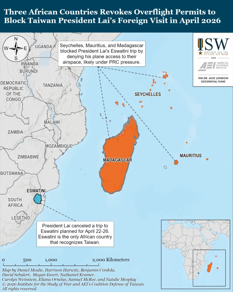 Taiwanese President William Lai Ching-te cancelled a planned visit to Taiwanese diplomatic ally Eswatini on April 21 after nearby Mauritius, Madagascar, and Seychelles revoked overflight permissions for his aircraft. The PRC very likely took unprecedented measures in pressuring third countries to help it disrupt Taiwan’s diplomatic engagements and erode Taiwanese sovereignty. The Seychelles Ministry of Foreign Affairs stated that the revocation was in line with Seychelles’ policy of refusing to recognize Taiwan diplomatically.[1] An official from Madagascar’s foreign ministry confirmed the revocation and stated that Madagascar “recognizes only one China.”[2] Most countries have a “one China policy” and do not recognize Taiwan as an independent state. This appears to be the first time a country has invoked the “one China policy” to block Taiwanese officials from flying through its airspace.