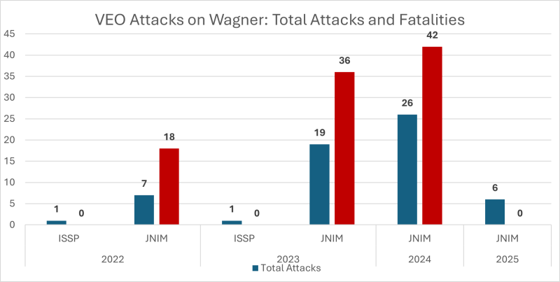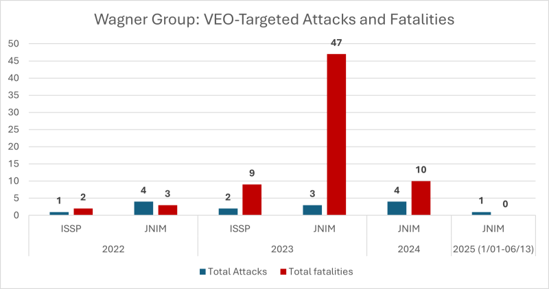During their tenure from December 2021 until June 2025, Wagner failed to achieve significant advances against VEOs. When comparing Wagner counterterrorism missions and VEO attacks on Wagner forces, the two sides carried out a similar number of operations, suggesting Wagner implemented a tit-for-tat military strategy rather than a maximum pressure campaign against the jihadists. In 2022, Wagner carried out five operations resulting in five fatalities. In 2023, the PMC fared a bit better, carrying out three attacks resulting in 47 JNIM fatalities. However, they were less effective in 2024 when four attacks yielded ten jihadist fatalities. Although Wagner forces were meant to supplement ground-based counterterrorism activities, Wagner never carried out more than four attacks against VEOs, with fatalities never reaching higher than 47. However, Wagner fatalities resulting from JNIM attacks steadily increased every year. Although there were no reported Wagner fatalities in 2025, media sources have yet to confirm JNIM’s claims of a successful attack on a FAMa-Wagner training camp on June 4, 2025.