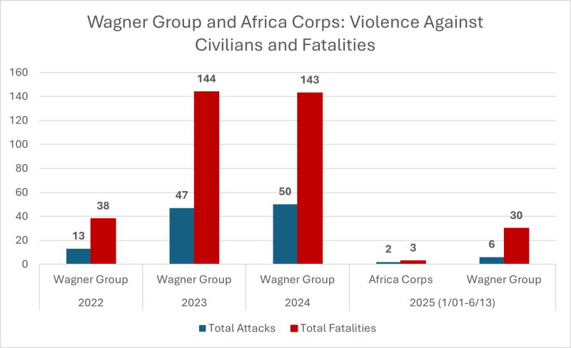The Africa Corps will also benefit from training and logistical support from Russian military advisers, suggesting the potential for better compliance to military protocol and international humanitarian law.[21] Although the Africa Corps answers to the Russian military, it is worth noting that 70 to 80% of the Africa Corps is reportedly made up of former Wagner members.[22] If the Wagner contingent is not required to undergo corrective training, it is possible they will carry their trigger-happy activities into the Africa Corps operational fold.