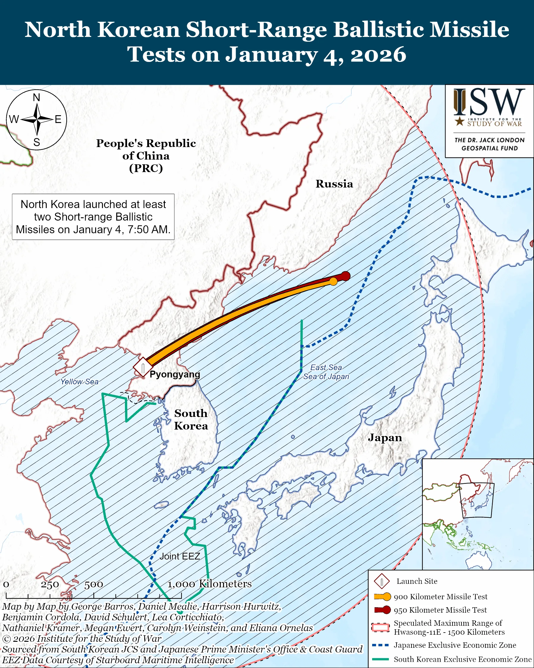North Korea launched at least two “supersonic” ballistic missiles on January 4.[87] The timing of the launch may signal Pyongyang’s intention to further accelerate military development in the face of recent events, including the United States’ capture of Venezuelan President Nicolas Maduro and the PRC-South Korea Summit.[88] The South Korean Joint Chiefs of Staff and the Japanese Prime Minister’s Office reported that two missiles, speculated as Hwasong 11-E, flew around 900km (559 miles) towards the East Sea/Sea of Japan.[89] South Korean national defense scholars speculated that the launch intended to verify the missiles’ low-altitude gliding flight capability and operational range.[90] The launch was the first since November 7 and the third launch of South Korean President Lee Jae Myung’s term.[91] North Korea has conducted tests of various types of missiles every month since October 2025.[92] Workers’ Party of Korea (WPK) General Secretary Kim Jong Un also inspected tactical guided weapons and ordered an increase in their production on the day before the missile launch.[93] Hwasong-11E, a low-altitude ballistic missile, has a maximum range of 1,500km, which would allow it to strike targets anywhere in the Korean Peninsula and the main islands of Japan.[94] This type of missile also employs anomalous maneuverability similar to cruise missiles, which evade missile defense networks more effectively than conventional missiles.[95]Kim Jong Un’s visit to a missile factory occurred just after the United States’ capture of Venezuelan President Maduro on January 3 and just before President Lee’s visit to Beijing on January 5.[96] Kim Jong Un stated the need to enhance North Korea’s nuclear deterrence and development of missiles to respond to recent unspecified “geopolitical crises” and “complicated international events.”[97] The US capture of Maduro, essentially a “decapitation” operation against an anti-US regime, likely reinforced his belief that highly advanced asymmetric weapons and nuclear weapons are necessary to deter the United States and other advanced military powers. The launch also likely serves as an expression on its discontent regarding the possibility of discussion on denuclearization issues during the Xi-Lee Summit. North Korea may justify this belief on the self-defense through facilitating and regularizing missile test and other military developments. North Korean officials have stated repeatedly that Pyongyang will no longer negotiate with the United States unless it drops its demand for denuclearization. North Korea will likely further strengthen its cooperation with Russia across various sectors, while continuously advocating for a coalition to stand against the “US-led order.”