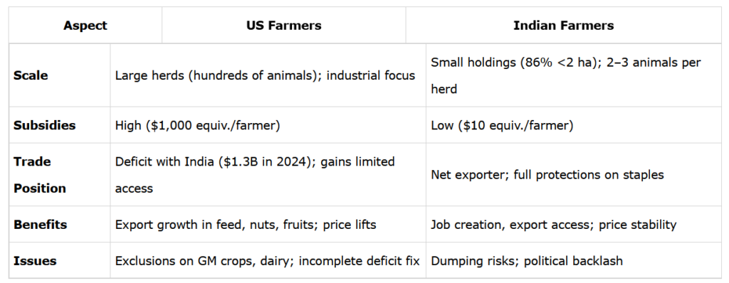 US and Indian farmers operate in starkly different contexts, shaping the deal’s asymmetric impacts. US agriculture is large-scale and heavily subsidized ($1,000 equivalent per farmer vs. India’s $10), enabling export aggression but limiting gains due to India’s GM bans and exclusions.